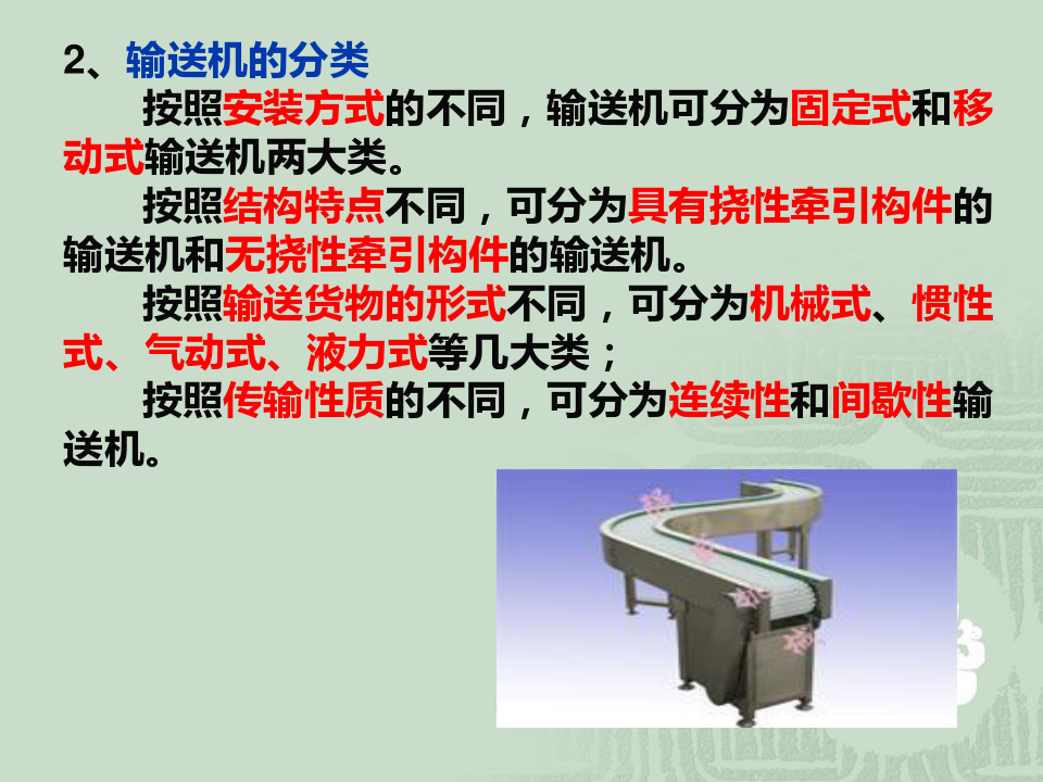 二、連續性輸送機 1、帶式輸送機。幾十米至上千米 2、螺旋式輸送機。一米以內至十幾米 3、氣力輸送機 4、斗式提升機 三、間歇性輸送機 根據輸送機有無動力源,可分為重力式和動力式兩大類。 重力式輸送機根據滾動體的不同,可分為滾輪式滾筒式和滾珠式三種形式。 動力式輸送機以電動機為動力,根據驅動介質的不同,可分為鏈條式、輥子、平帶輸送機和懸掛式輸送機等。