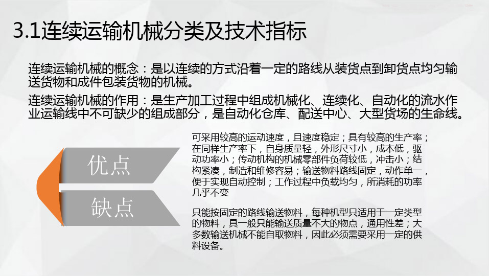 優(yōu)點(diǎn) 可采用較高的運(yùn)動(dòng)速度,且速度穩(wěn)定;具有較高的生產(chǎn)率;在同樣生產(chǎn)率下,自身質(zhì)量輕,外形尺寸小,成本低,驅(qū)動(dòng)功率小;傳動(dòng)機(jī)構(gòu)的機(jī)械零部件負(fù)荷較低,沖擊小;結(jié)構(gòu)緊湊,制造和維修容易;輸送物料路線固定,動(dòng)作單一便于實(shí)現(xiàn)自動(dòng)控制;工作過(guò)程中負(fù)載均勻,所消耗的功率幾乎不變 缺點(diǎn) 只能按固定的路線輸送物料,每種機(jī)型只適用于一定類(lèi)型物料,具一般只能輸送質(zhì)量不大的物點(diǎn),通用性差;大多數(shù)輸送機(jī)械不能自取物料,因此須需要采用一定的供料設(shè)備。