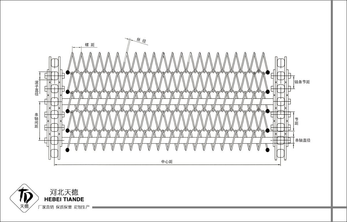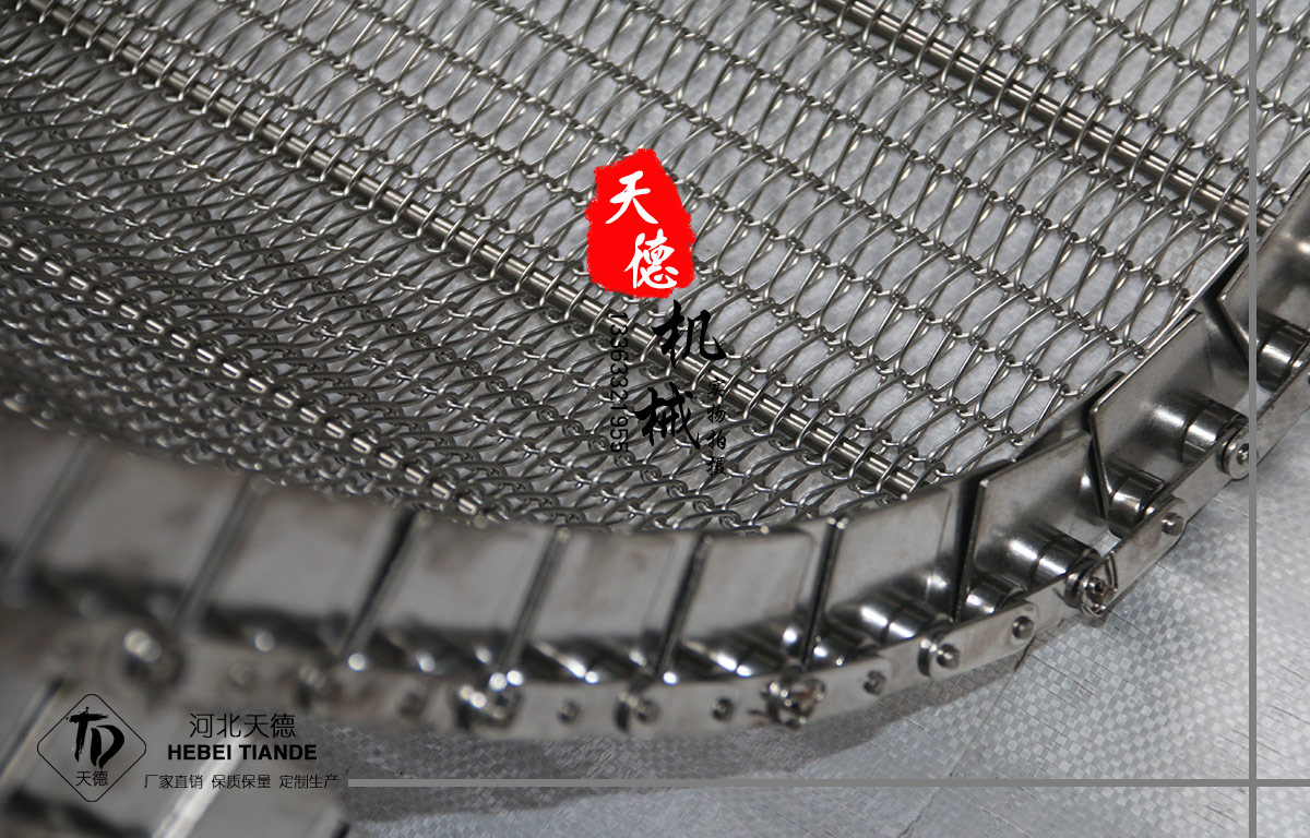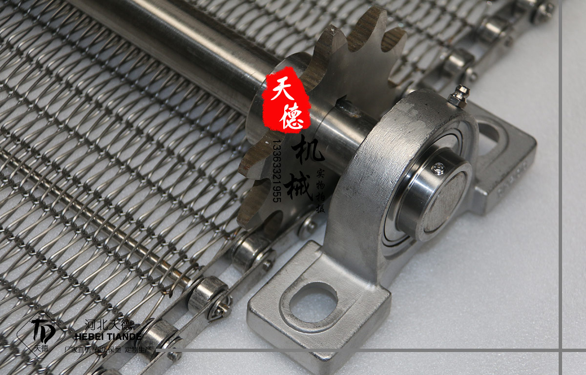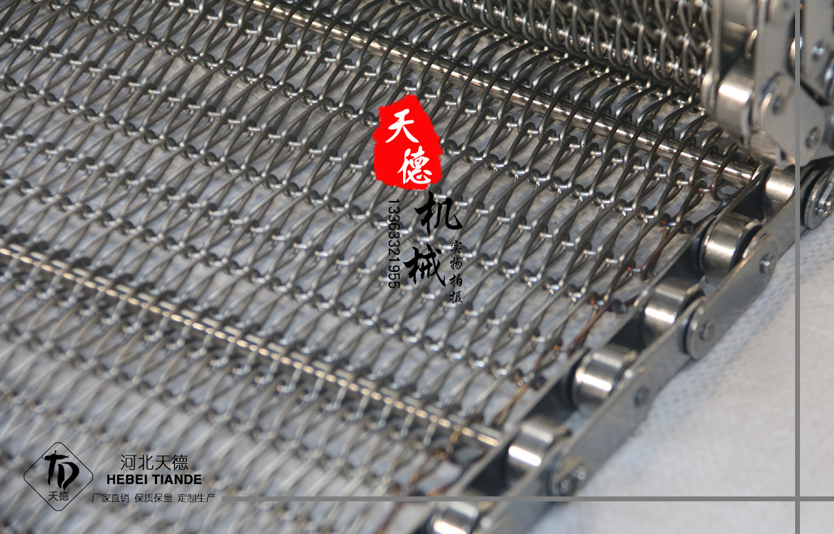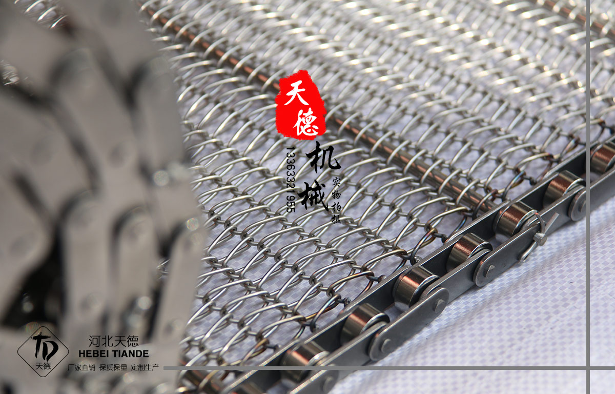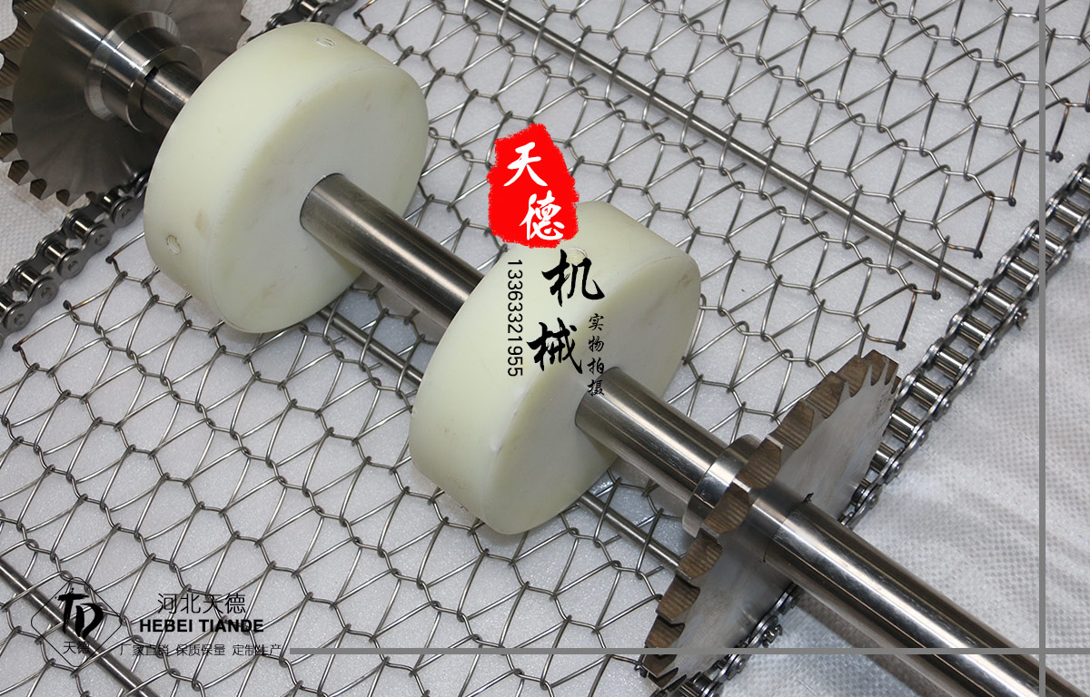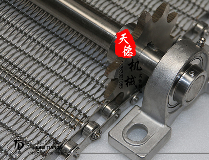 網(wǎng)帶都采用軋牙串條、左右網(wǎng)條二根串,并大小網(wǎng)條連接而成,大網(wǎng)條內(nèi)穿進(jìn)小軸,小軸二端穿入鏈條孔,從而達(dá)到鏈條驅(qū)動輸送網(wǎng)帶。鏈條網(wǎng)傳動平穩(wěn)、傳動力矩小。