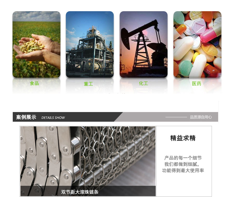 廣泛用于玻璃制品行業(yè)的退火爐網(wǎng)帶、烤花爐網(wǎng)帶等。食品加工行業(yè)、脫水蔬菜、速凍食品單凍機(jī)前處理網(wǎng)帶、鏈網(wǎng)。粉末冶金、金屬熱處理、淬火、燒結(jié)、釬焊、焙燒、光亮、發(fā)黑、軸承、滲碳高溫爐網(wǎng)帶、擋板式網(wǎng)帶、涂裝烘干線輸送網(wǎng)帶、泡沫鎳還原生產(chǎn)線網(wǎng)帶,清洗機(jī)、提升機(jī)、干燥機(jī)、烘干機(jī)、固化爐網(wǎng)帶。