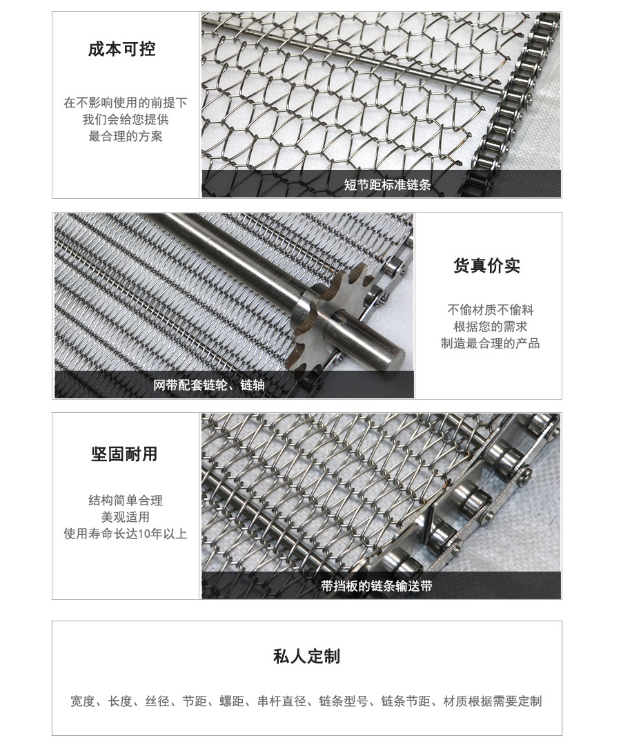 不銹鋼網(wǎng)帶屬于非標(biāo)準(zhǔn)件,我們將根據(jù)你提供的規(guī)格長寬,材質(zhì),絲徑,編制結(jié)構(gòu)尺寸,支軸直徑,支軸間距,鏈條型號等數(shù)據(jù)核算成本和制作.