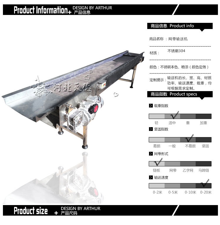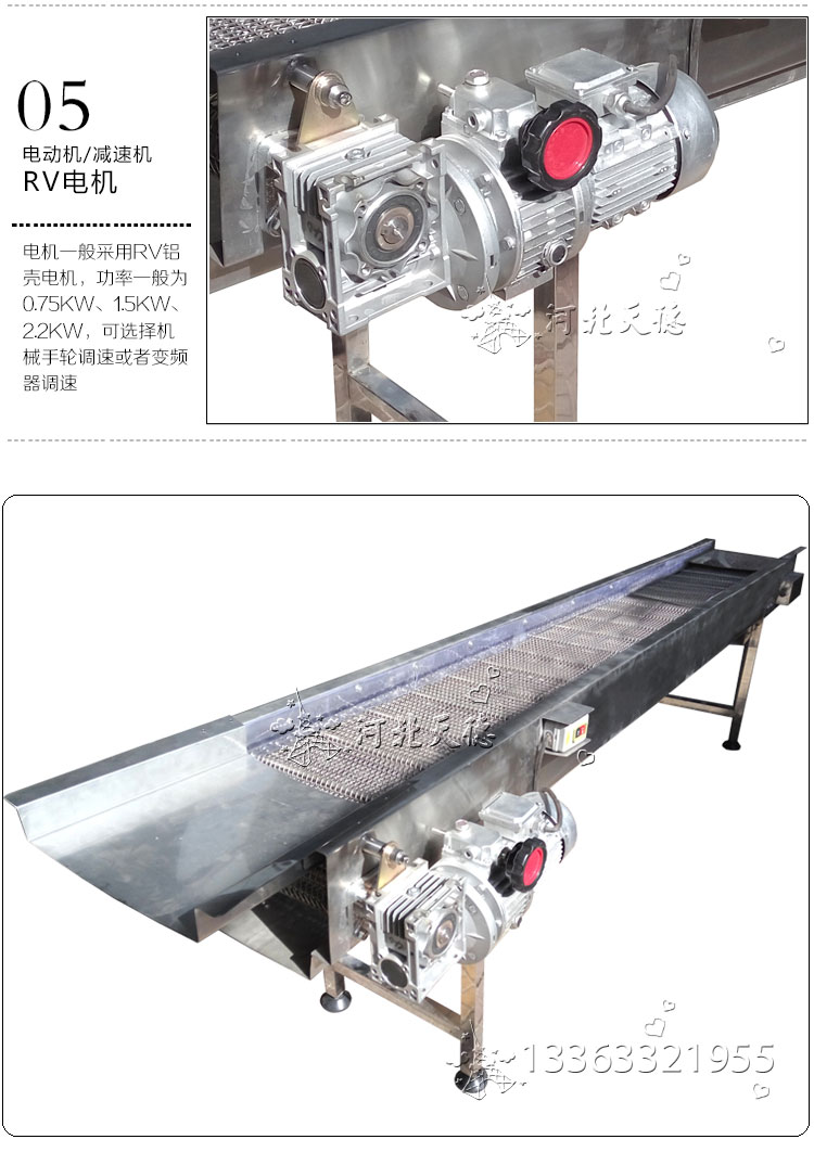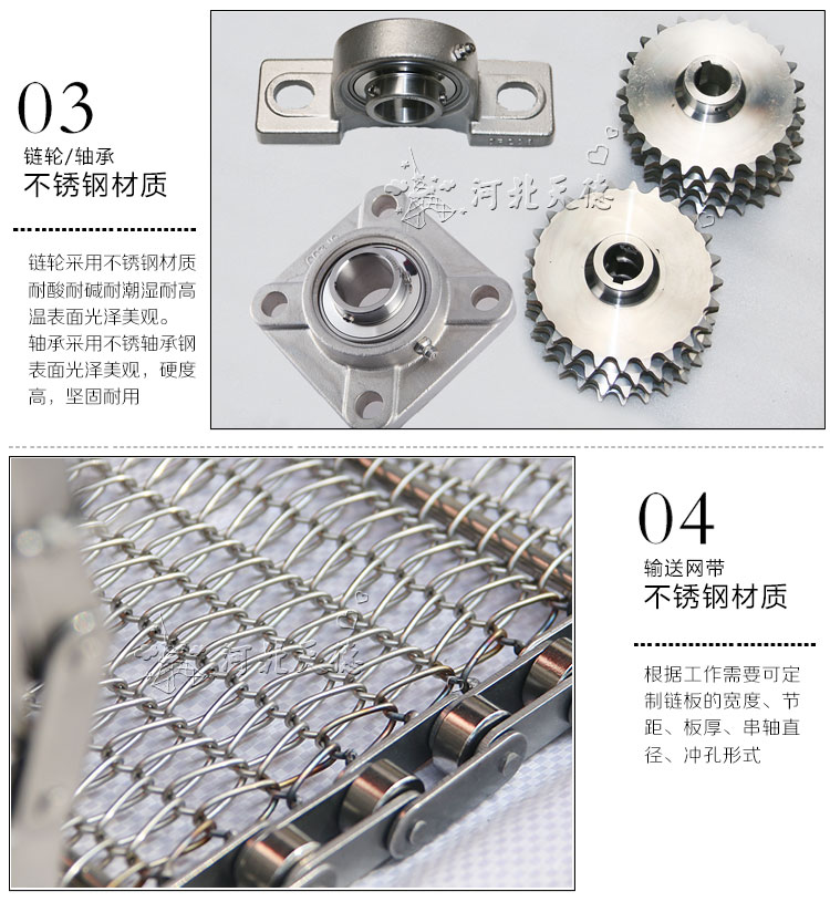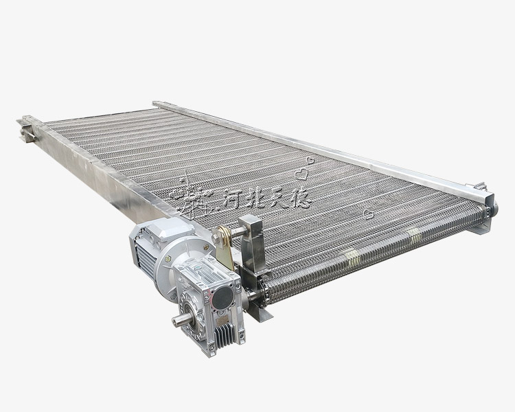 設備特點: 網帶輸送機以不銹鋼網帶作牽引件輸送物料,運行平穩、造型美觀、使用壽命長。