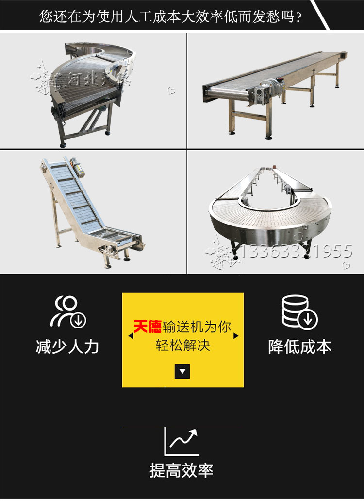 結構形式有: 水平直線輸送、提升爬坡輸送、轉彎輸送等多種形式,輸送帶上還可增設提升擋板、側擋板邊等附件,能滿足各種工藝要求。
