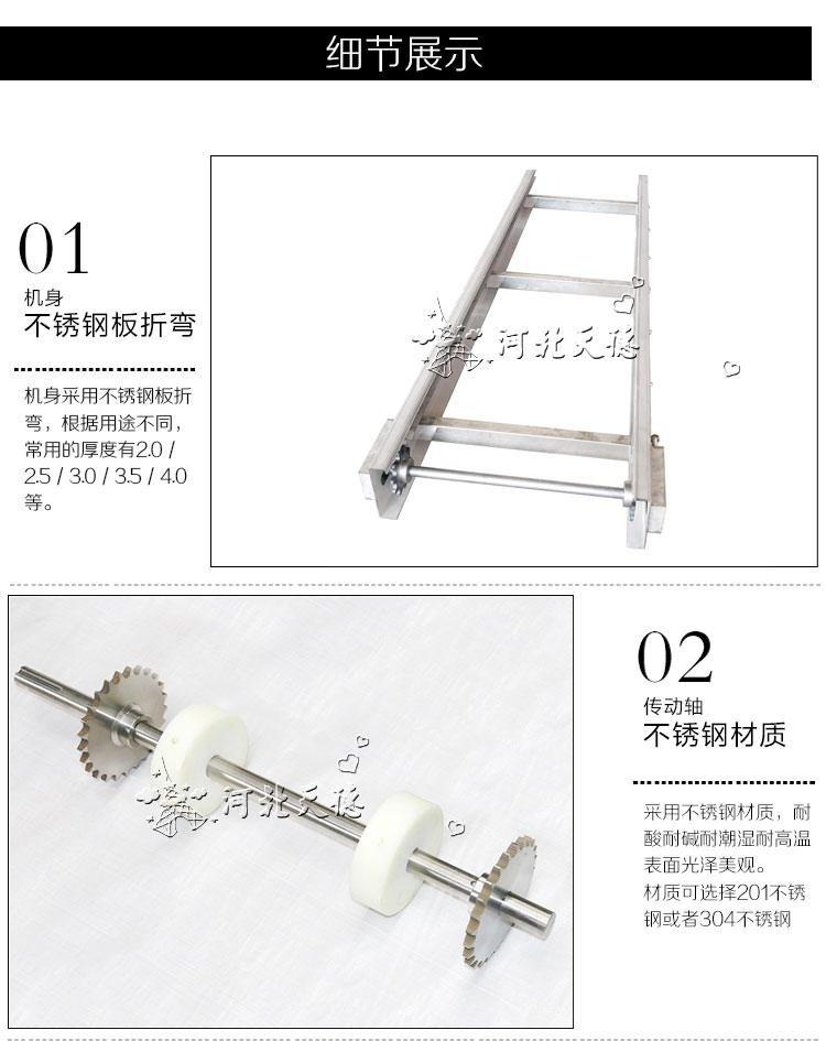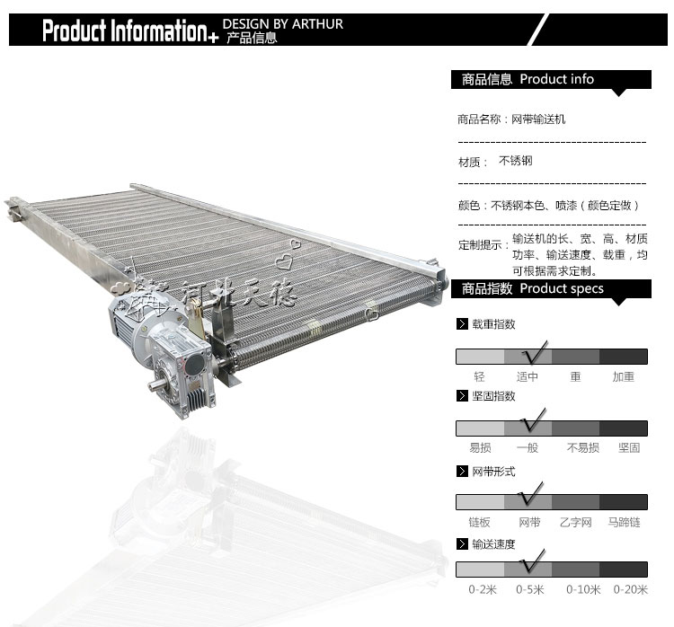 網(wǎng)帶輸送機(jī)結(jié)構(gòu)形式: 水平直線輸送、提升爬坡輸送、轉(zhuǎn)彎輸送等多種形式,輸送帶上還可增設(shè)提升擋板、側(cè)擋板等附件,能滿足各種工藝要求。輸送機(jī)材質(zhì):有A3低碳鋼、201不銹鋼、304不銹鋼等。