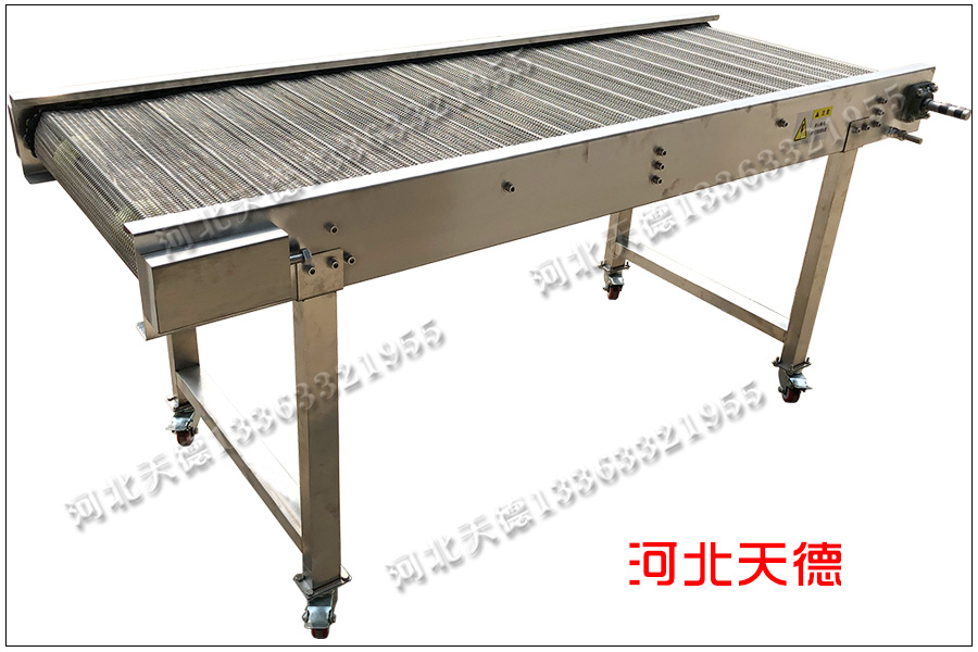 小型網帶輸送機外觀漂亮,移動方便,成本低,采用不銹鋼304材質鏈條鋼絲網輸送帶加工,鏈條采用大滾珠雙節距鏈條輸送,此種鏈條輸送輕便,磨損少,拉力輕,承載能力大。現在好多大型企業都采用大滾珠鏈條來輸送。